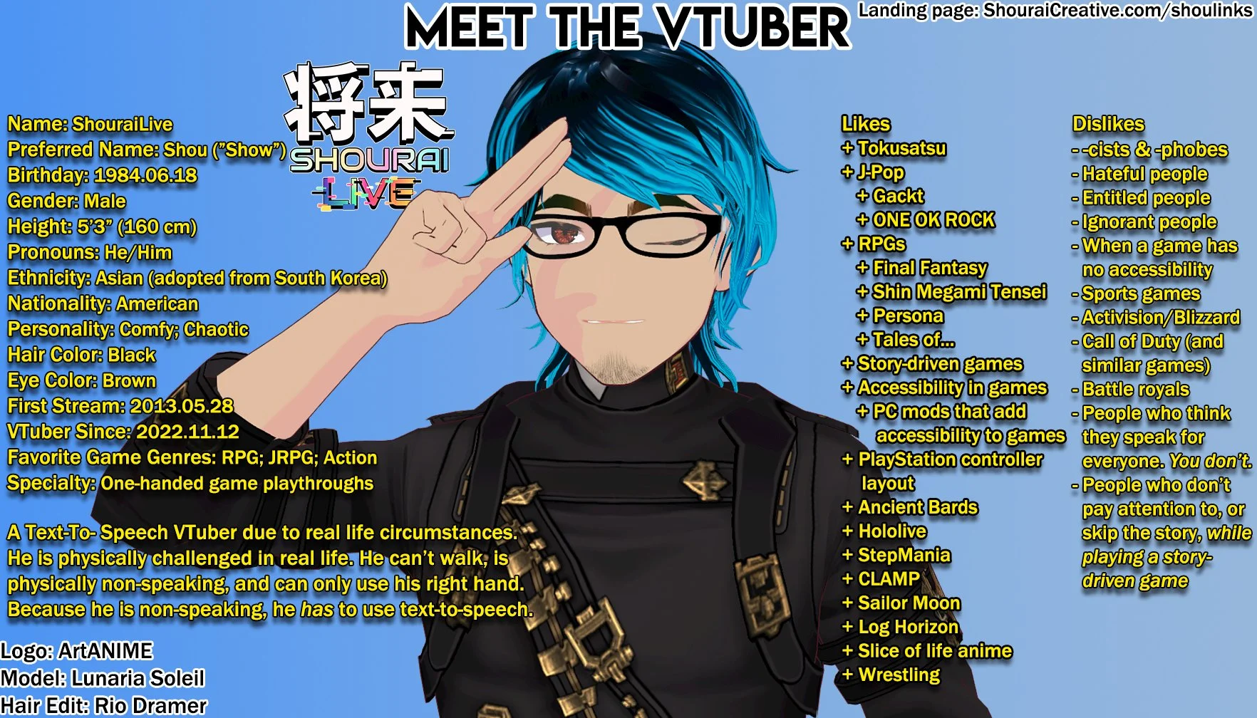 I was getting tired of my disability being so front and center on cam as most people aren’t patient enough to wait for me to even use my text-to-speech. So, I decided to change to a Vtuber in November 2022. As a VTuber, I feel like people are more patient. That’s something I noticed immediately. Some people are still impatient but it is by far nowhere near as bad as it was/is in the flesh.